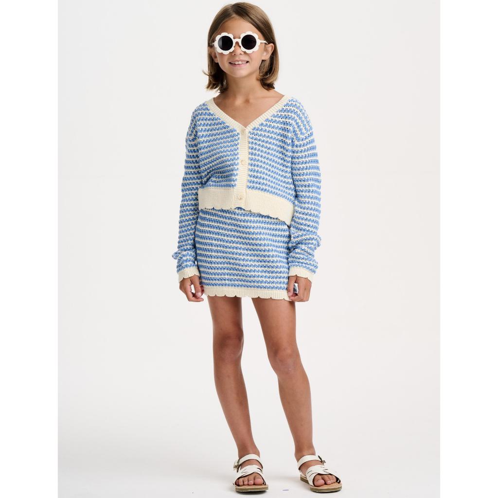 Blue and white knitted skirt with an elasticated waistband and finished with a scalloped hemline.