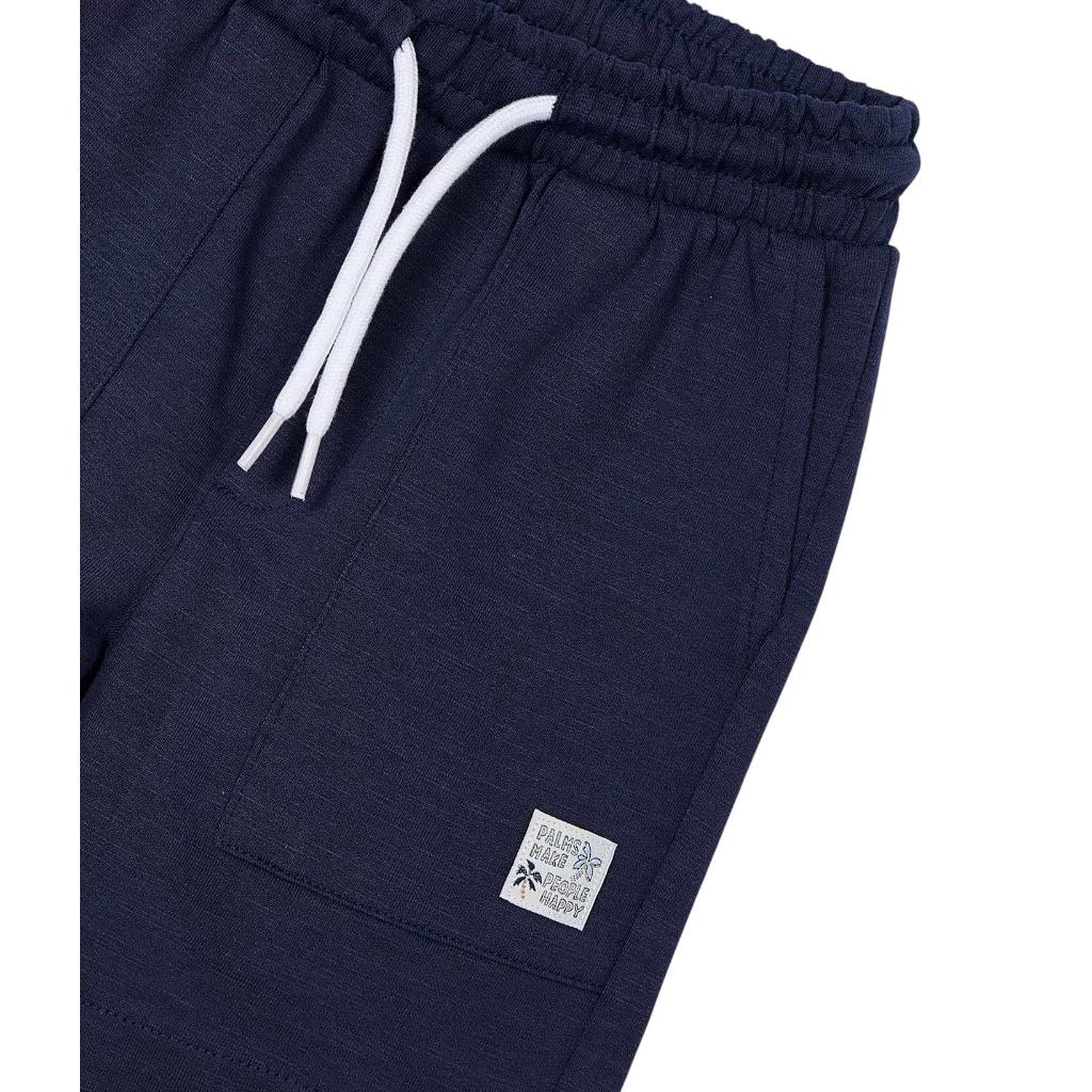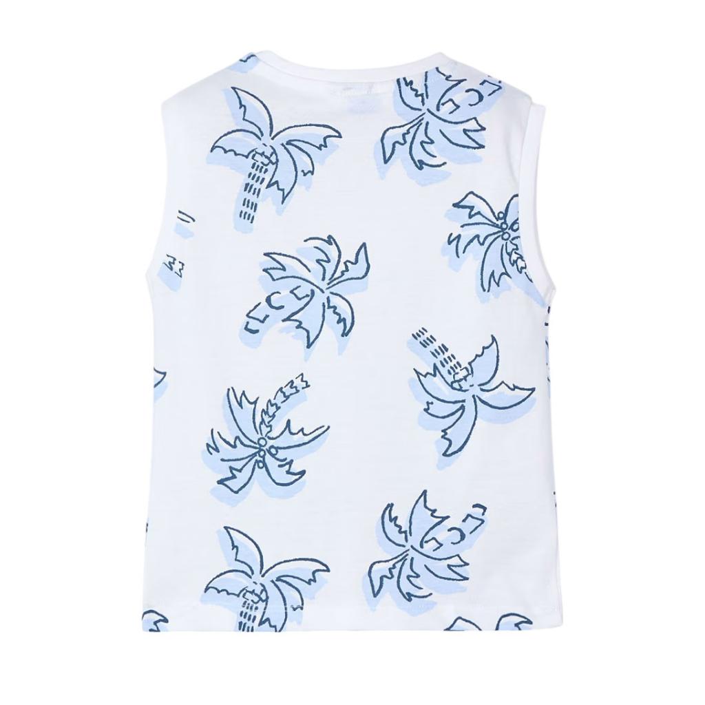 3 piece set comprising of a short sleeved t shirt with a round neckline and a printed palm tree on the front, sleeveless t shirt with a round neckline in an all over printed palm tree design,matching easy to wear jersey shorts have 2 front pockets and a fully elasticated drawstring waistband.