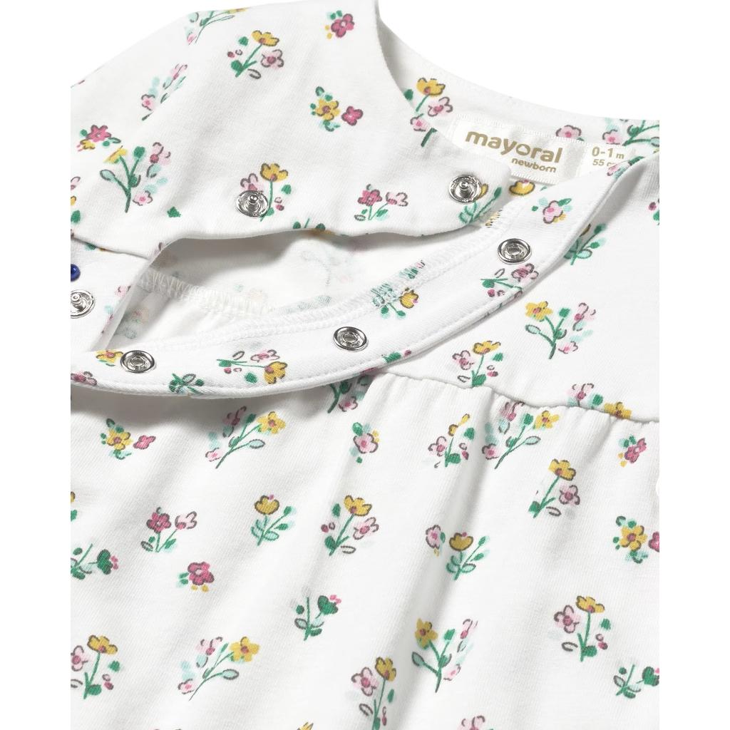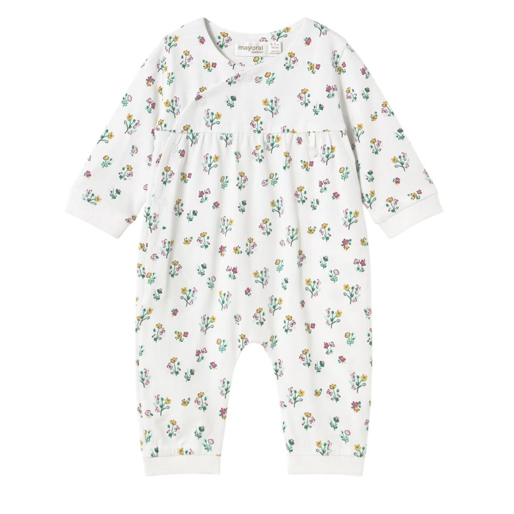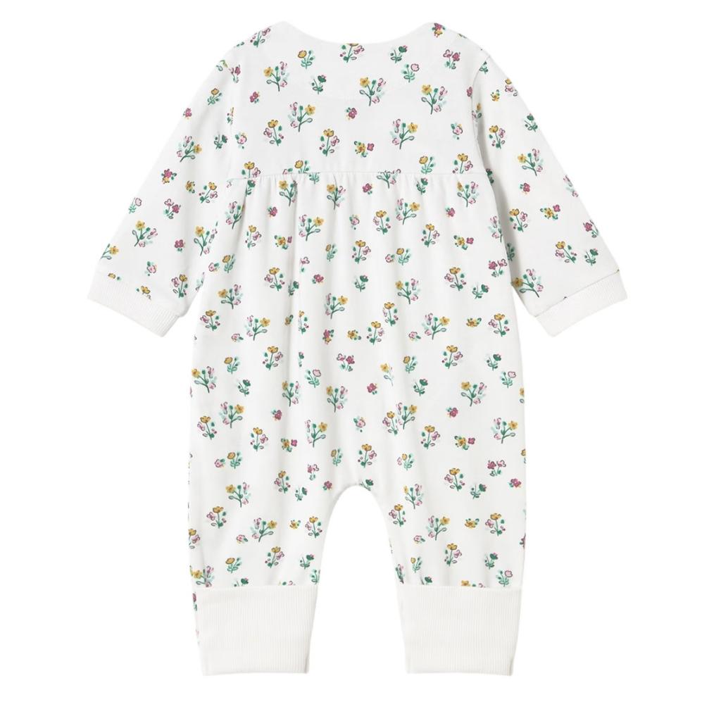 Front fastening all in one in a pretty all over floral print fabric, The bottom of the leg has a ribbed cuff which can be worn footless or folded over at the feet.