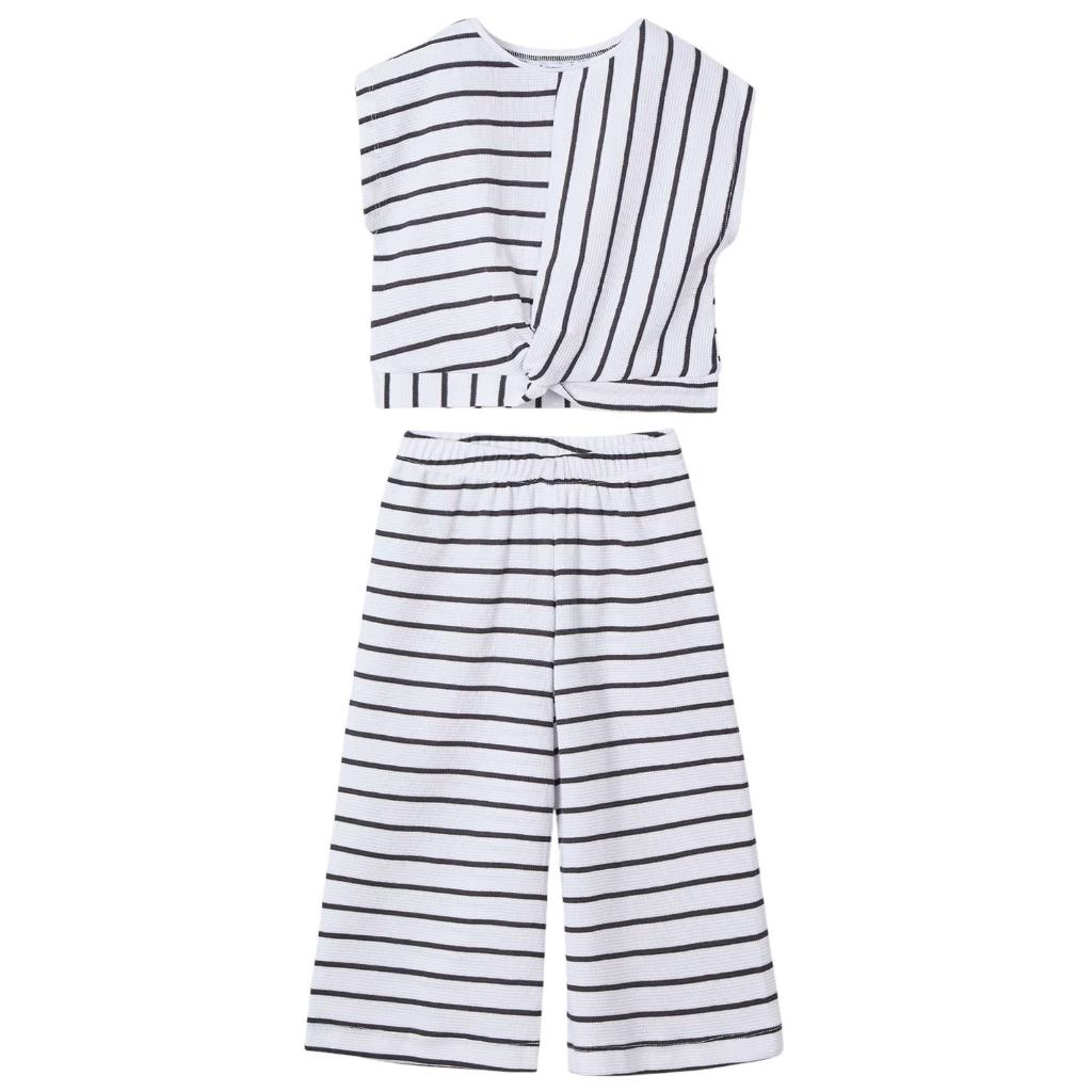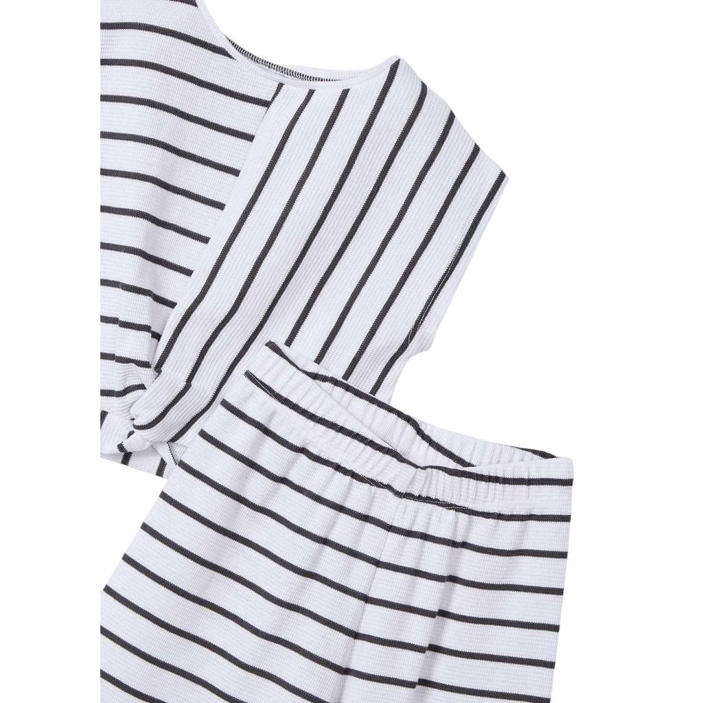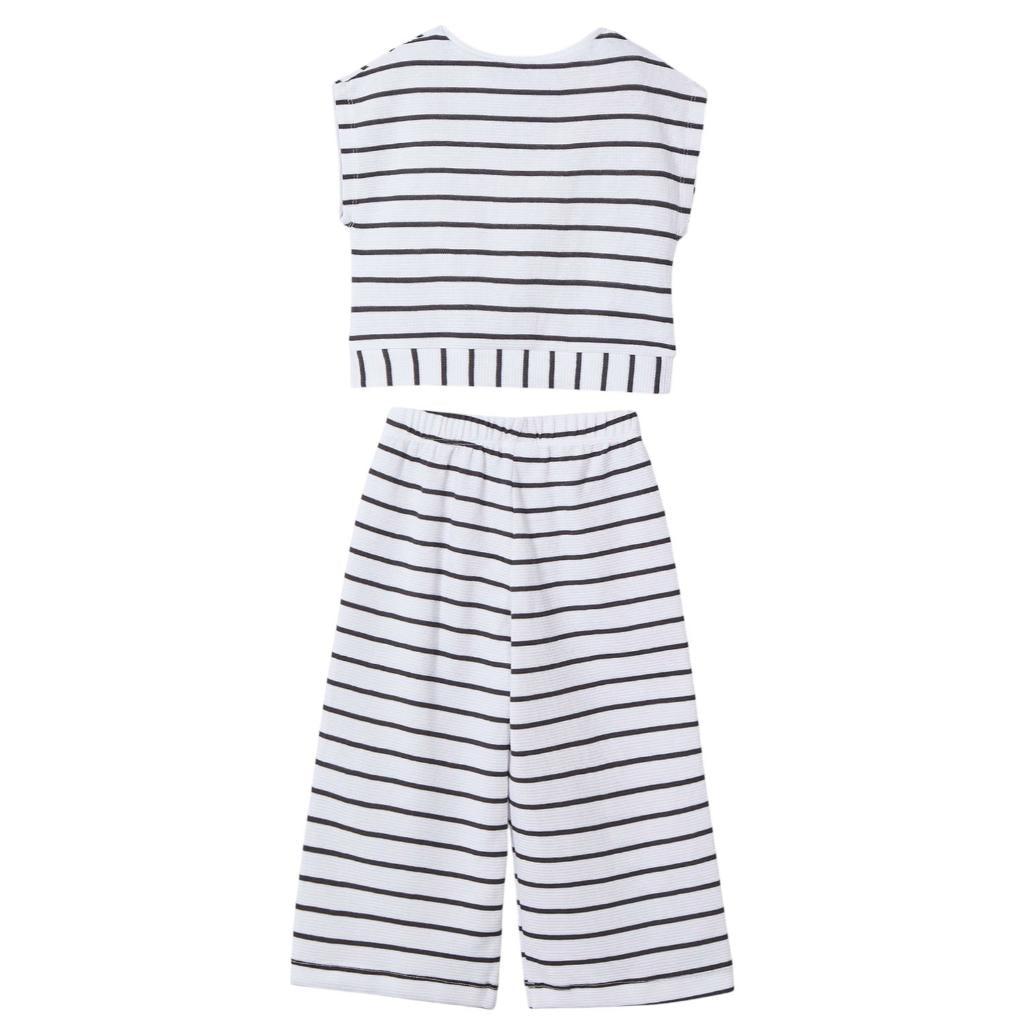 Shorter length sleeveless summer top in a dark grey and white stripe, matching wide leg striped trousers have a fully elasticated waistband.
