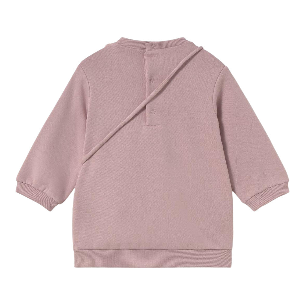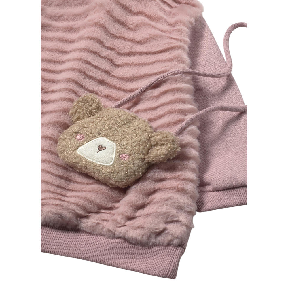 Long sleeved dress with a round neckline. The front of the dress is in a ribbed faux fur, fastens at the back with poppers and a matching teddy bear face bag completes the outfit.