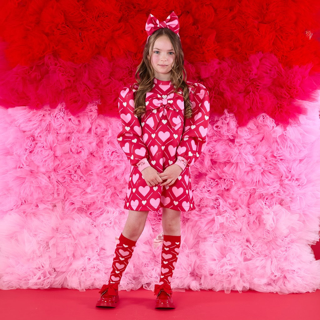 The Libby heart print dress features the cutest bow detail on the front with puff long sleeves. Perfect addition to your winter wardrobe!