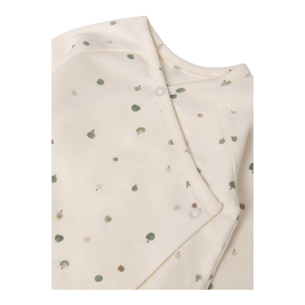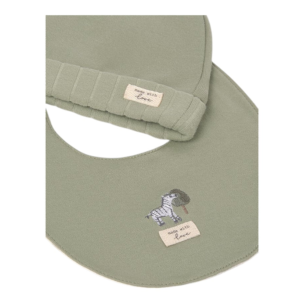Front fastening all in one in an all over unisex print design with fold over cuffs and a matching bib and hat to complete the outfit.