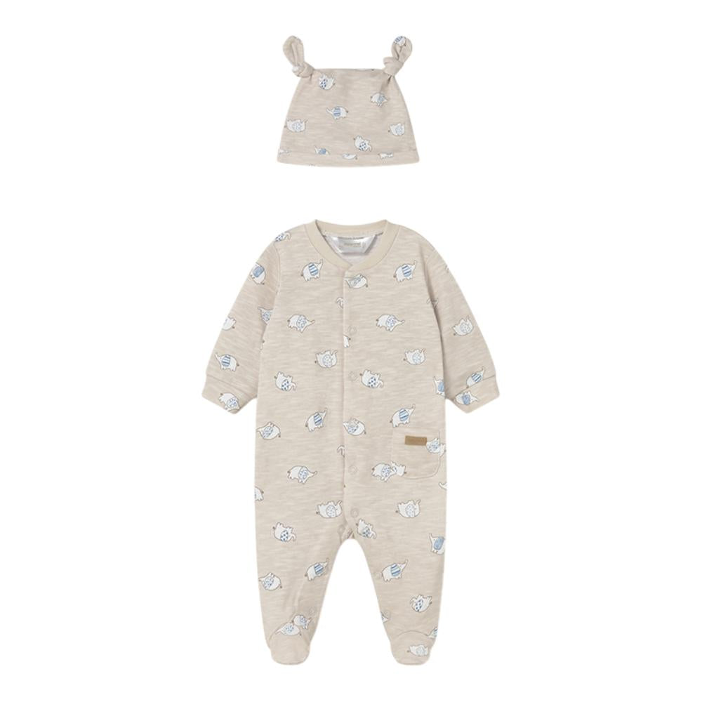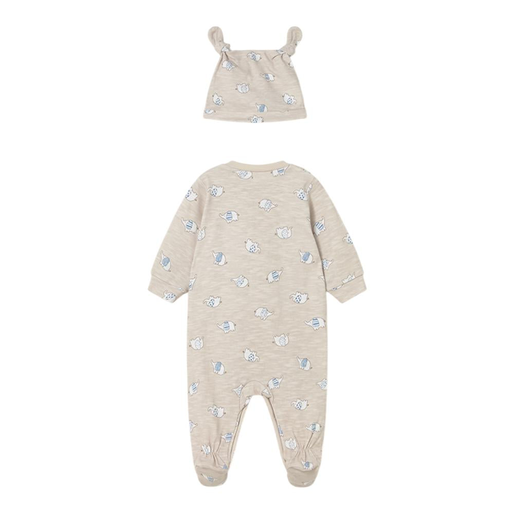 This Mayoral cotton all‑in‑one and matching hat offers soft, breathable comfort with a cute all‑over animal print — perfect for cosy, gentle newborn dressing.