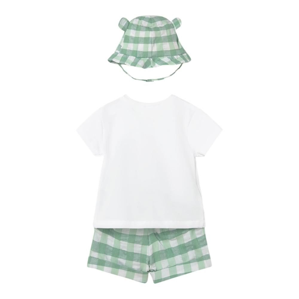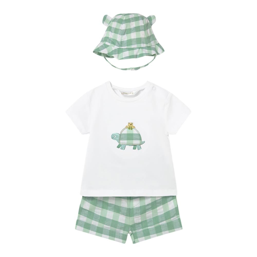 This adorable outfit includes a soft white T‑shirt featuring a playful turtle and frog motif, paired with matching green gingham shorts for a fresh, timeless look. The sweet gingham hat with little ears completes the ensemble, offering both sun protection and irresistible charm. A lovely choice for everyday adventures, holidays, or gifting.