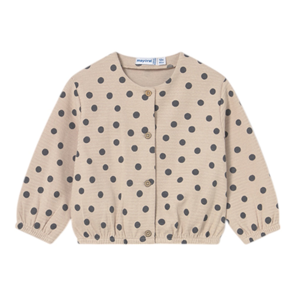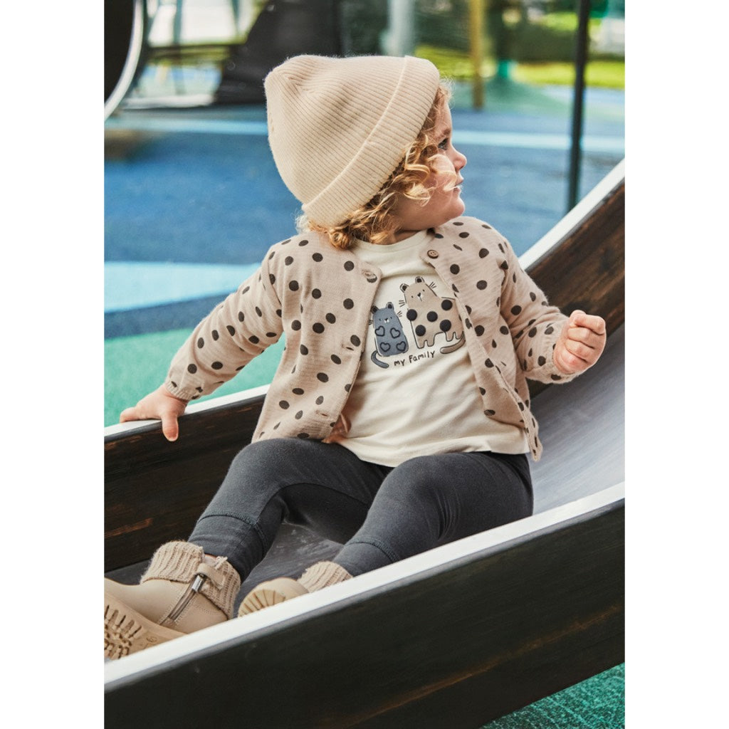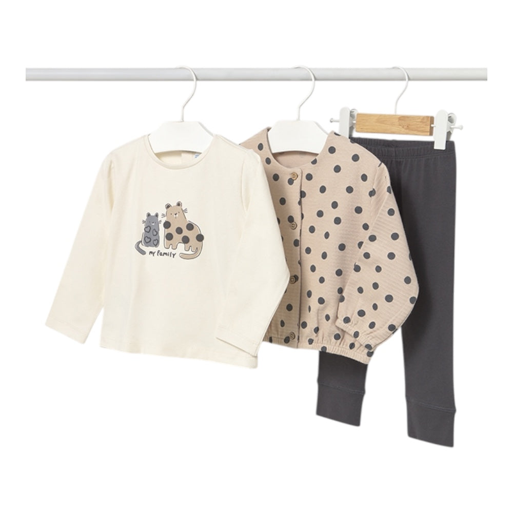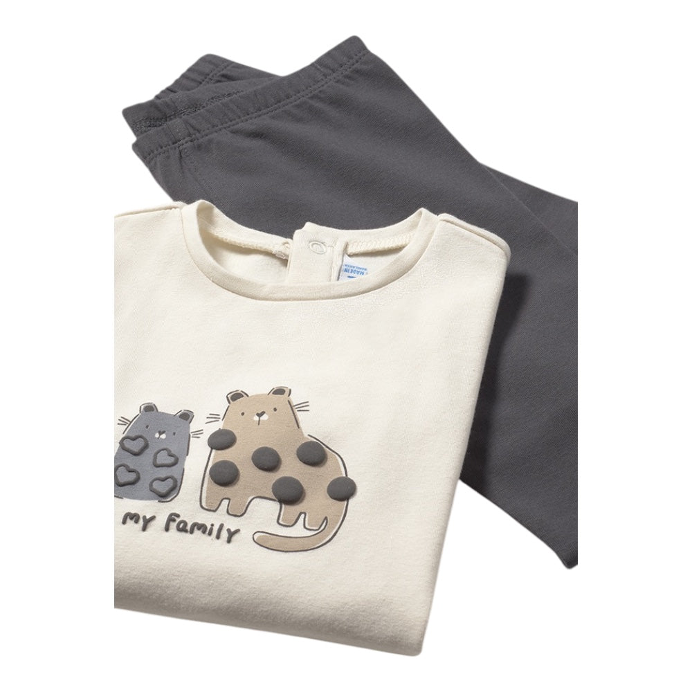 Long sleeved t shirt finished with a printed cat design on the front, matching jacket has a front button fastening and is elasticated at the cuffs and waist.