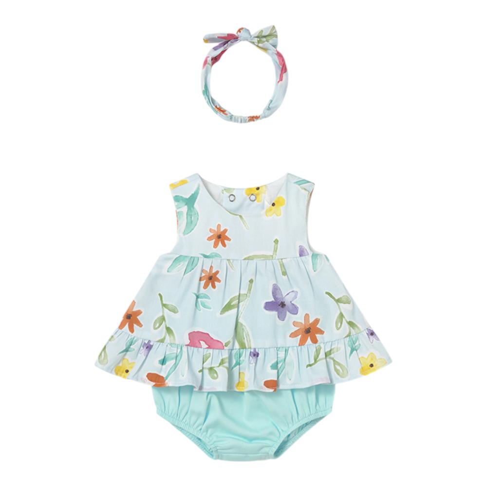 The light‑blue jam pants pair perfectly with the dress, offering gentle elastic at the waist and legs for a comfy fit that stays in place during wriggling, crawling, and play. The matching floral headband, tied in a sweet bow, completes the outfit with an adorable finishing touch.
