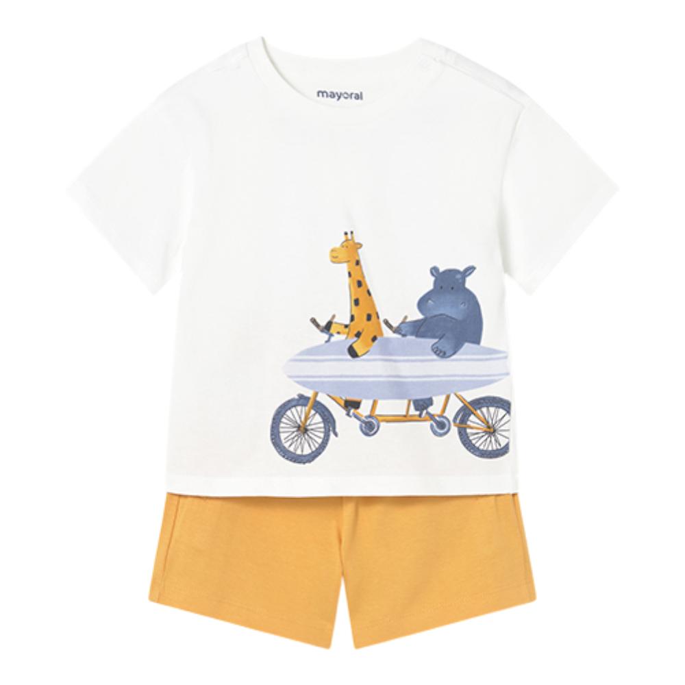 Full of fun and imagination, this baby boys’ short set is perfect for sunny days and little adventurers. The soft white T‑shirt features a delightful illustration of a giraffe and hippo riding a tandem bicycle — a whimsical design that feels straight out of a storybook and is sure to spark smiles.