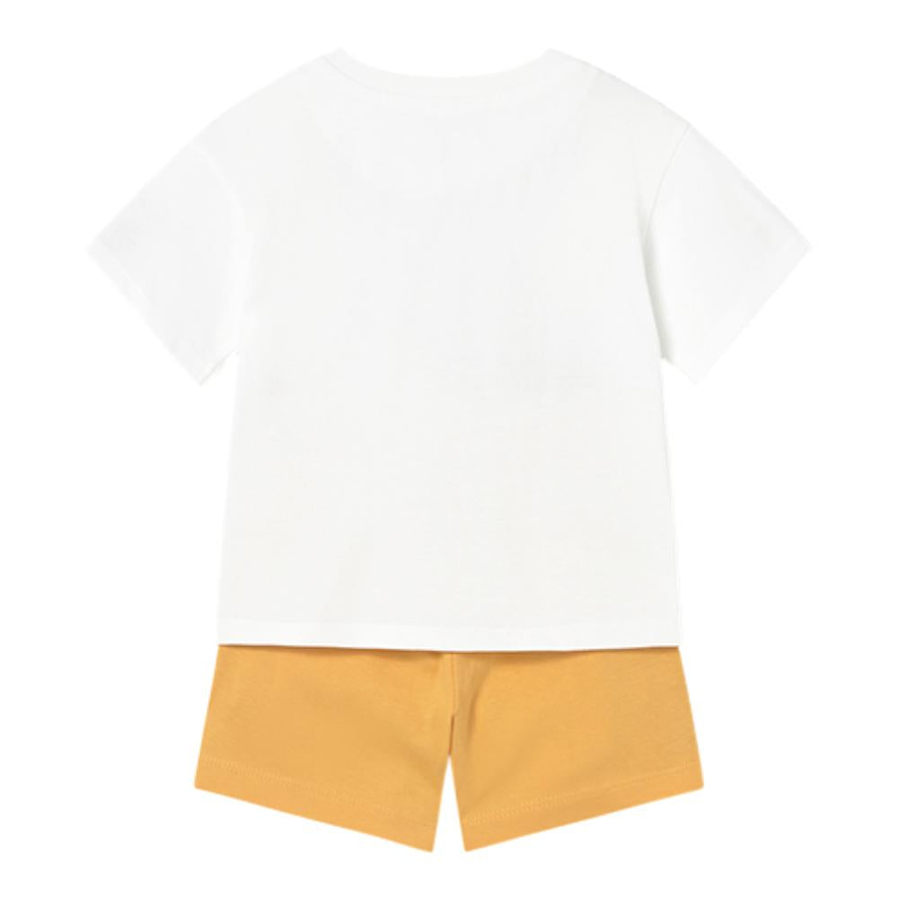 Paired with mustard‑yellow shorts, the outfit is as practical as it is cute. The shorts feature an elasticated waistband with a drawstring for a comfy, adjustable fit, plus a lightweight feel ideal for warm weather and active play.