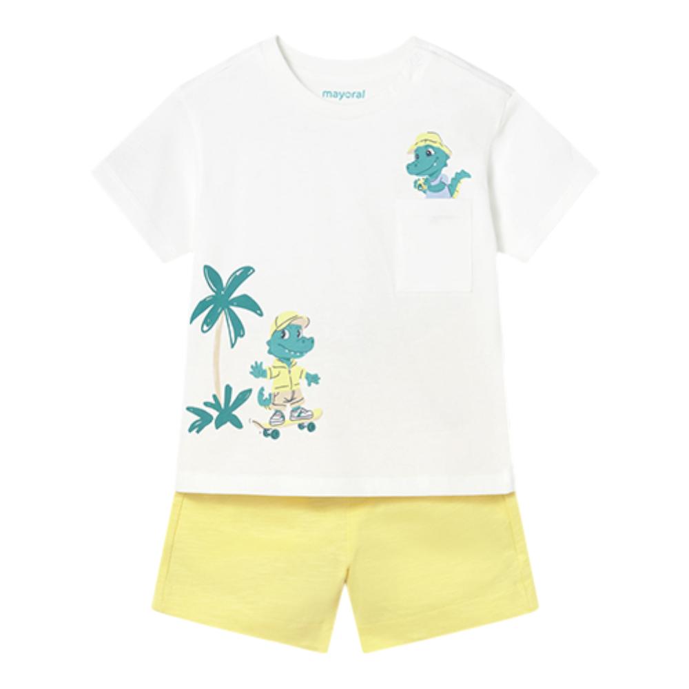 Bright, playful, and ready for adventure, this baby boys’ short set is perfect for sunny days and little explorers. The soft white T‑shirt features cheerful dinosaur characters — one cruising on a skateboard beneath palm trees and another peeking out from the chest pocket with a camera in hand. It’s full of personality and guaranteed to spark smiles.