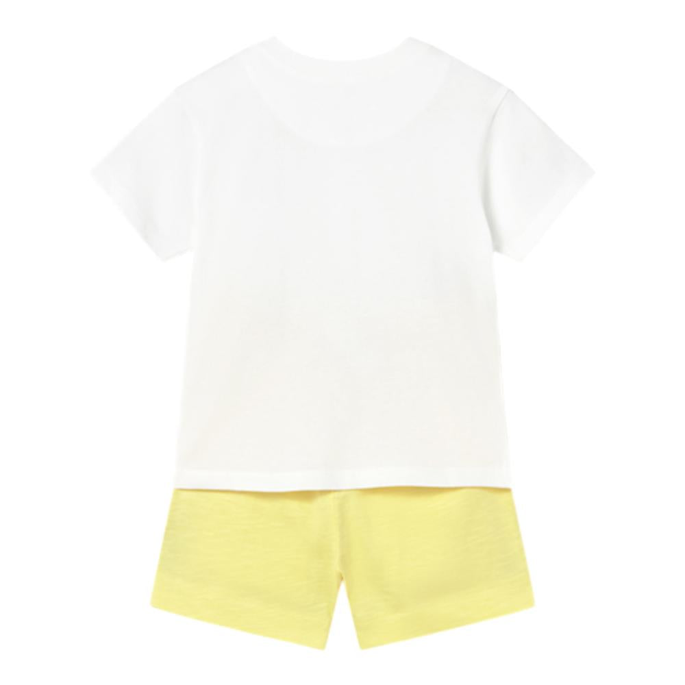 The matching yellow shorts bring a burst of sunshine to the outfit, designed with an elasticated waistband and drawstring for a comfy, adjustable fit. Side pockets add a practical touch for tiny treasures collected along the way.