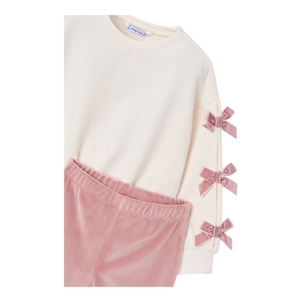 Long sleeved sweatshirt gathered with pin tucks onto the waistband at the front and finished with pretty velvet appliquéd bows down each sleeve.