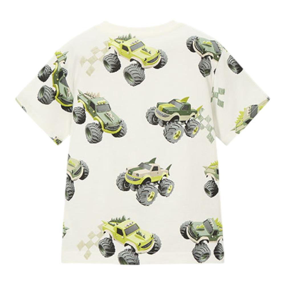 A bold, adventure‑ready tee for little ones who love big wheels and big fun. This white short‑sleeve T‑shirt features an all‑over monster truck print in bright, dynamic colours, giving it a lively, action‑packed feel. The playful design makes it an instant favourite for everyday wear, playdates and weekend adventures.