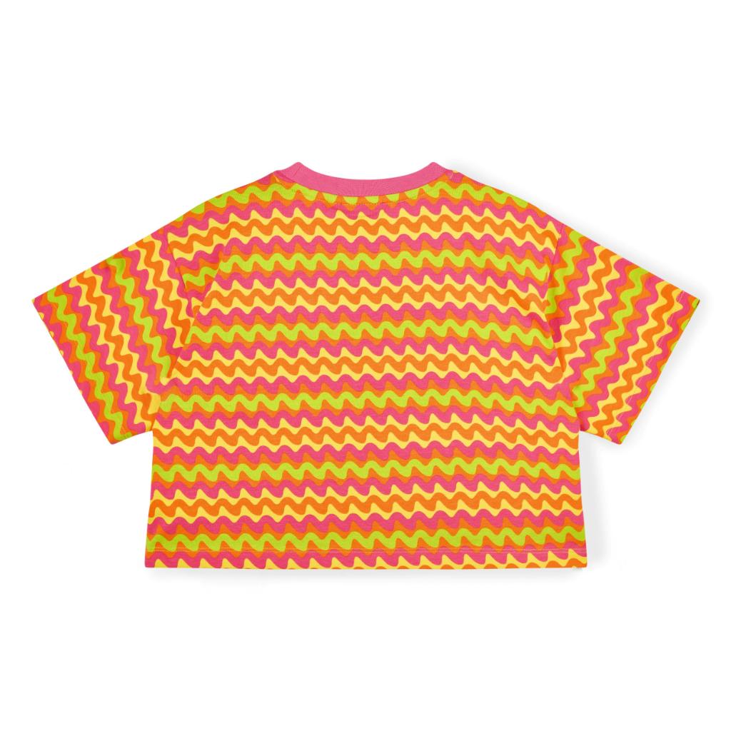 The Thea set features a cropped zig zag print top with classic diamante branding on the front. Paired with flared trousers in matching zig zag print with a diamante logo on one leg.