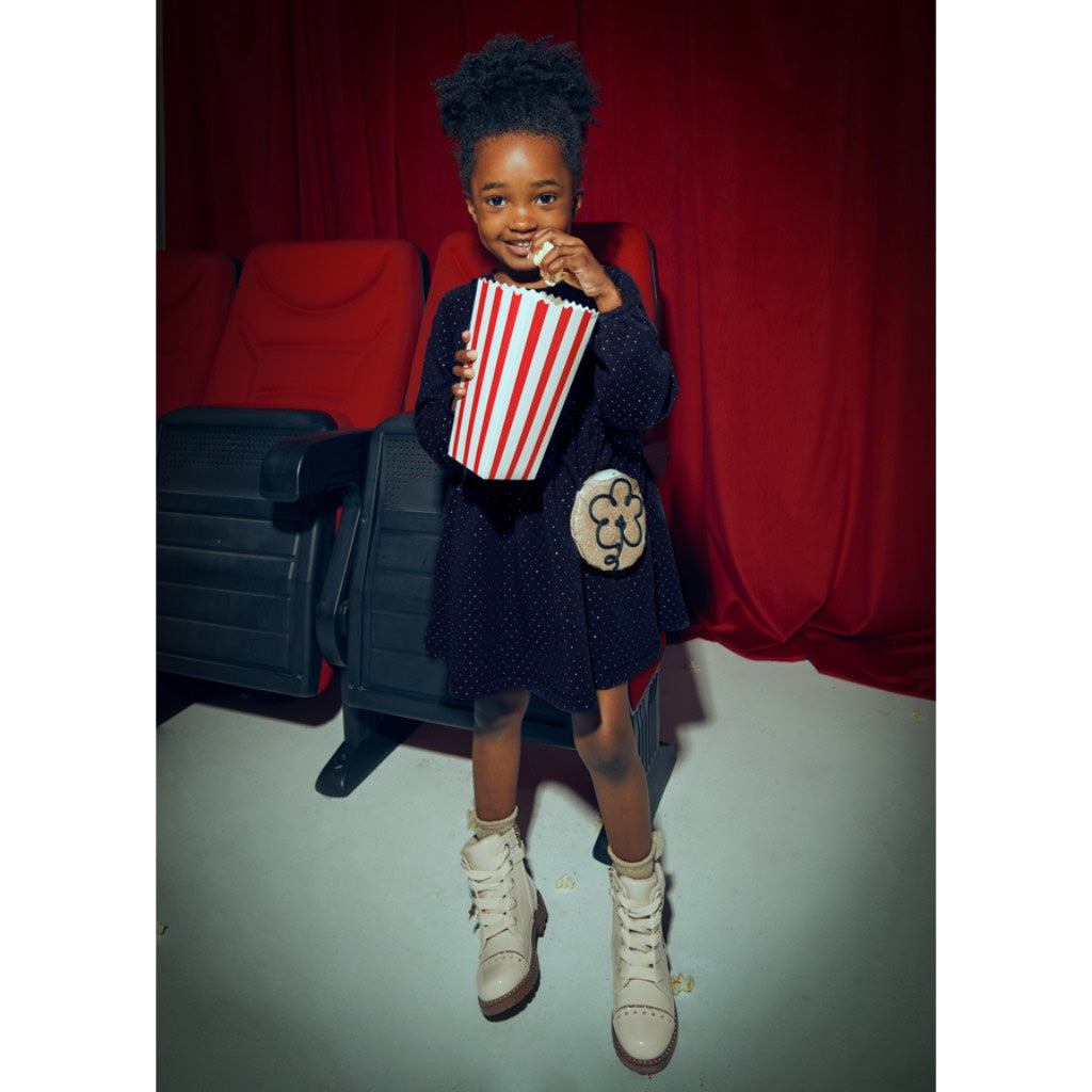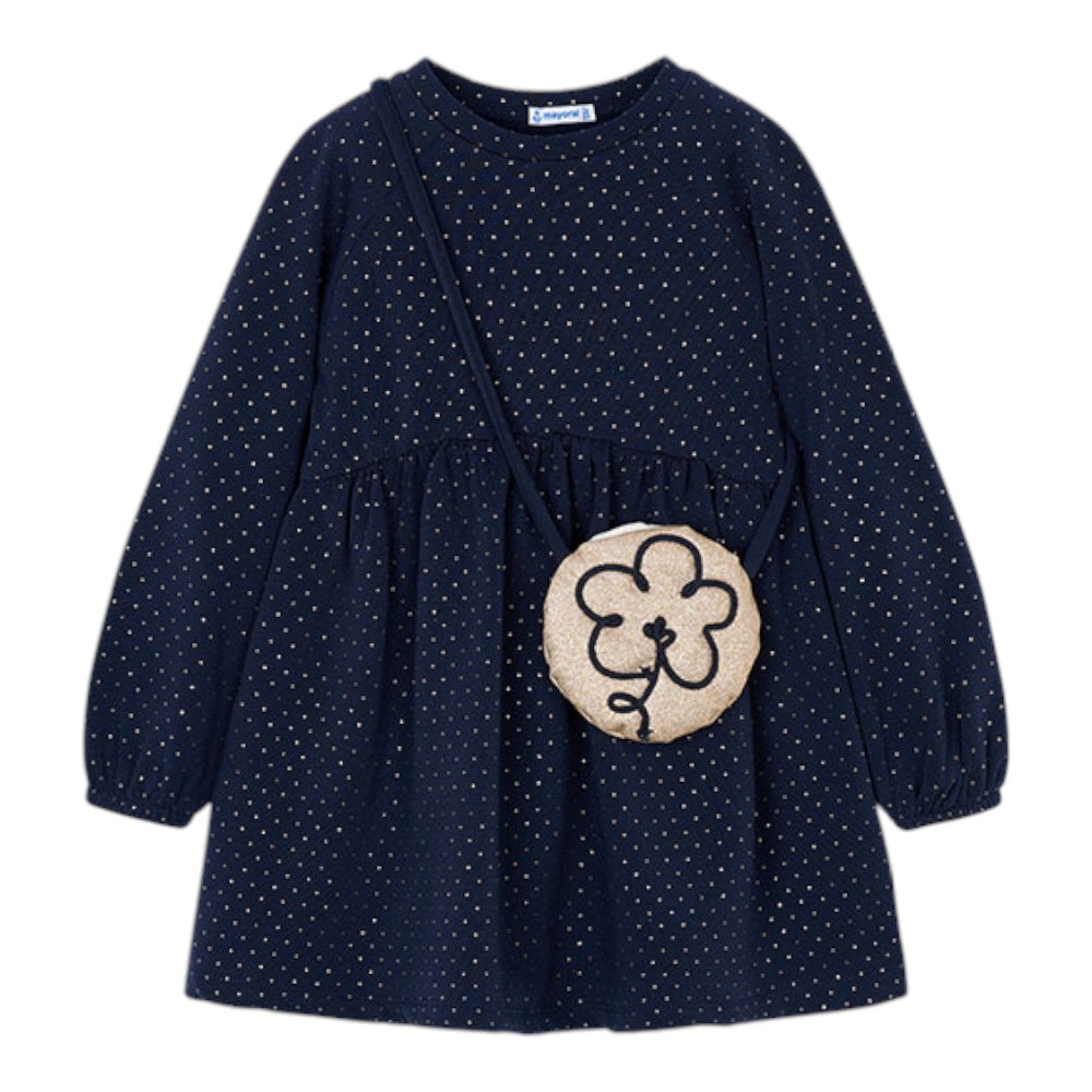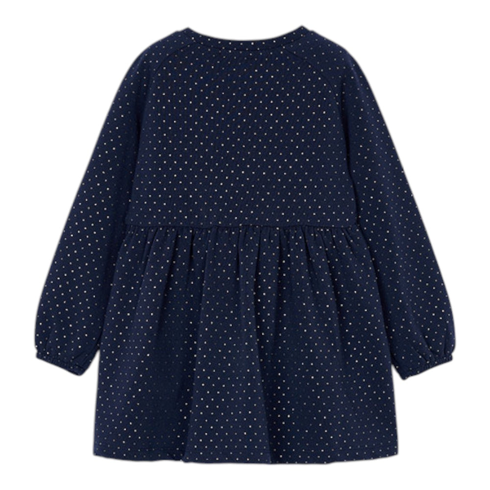 Easy to wear long sleeved jersey dress finished in an all over gold sparkle dot design.