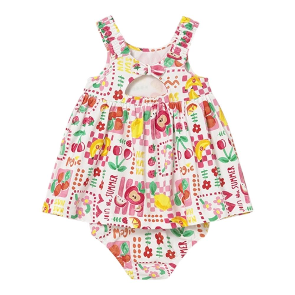 Bursting with colour and sunshine, this adorable baby dress and matching knickers set is made for magical summer days. The sleeveless dress features soft ruffled straps and a sweet keyhole neckline finished with a tiny bow at the back— a charming little detail that parents always love.