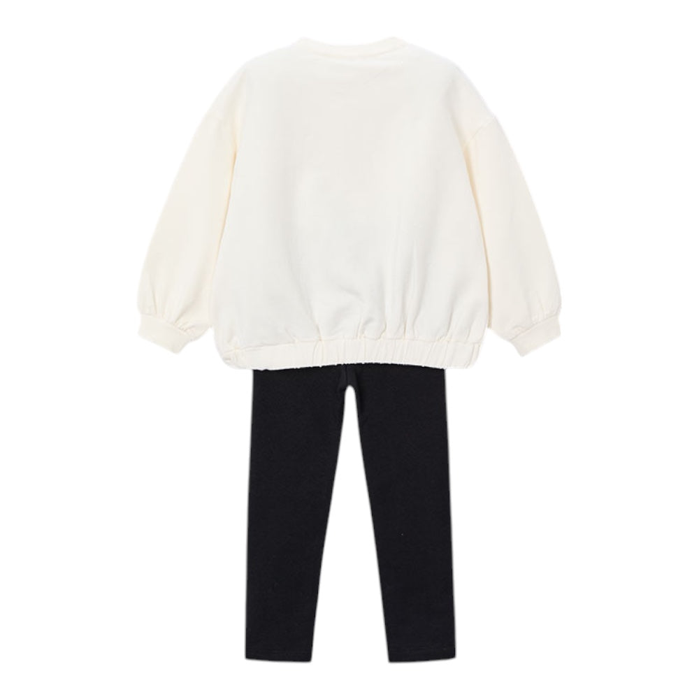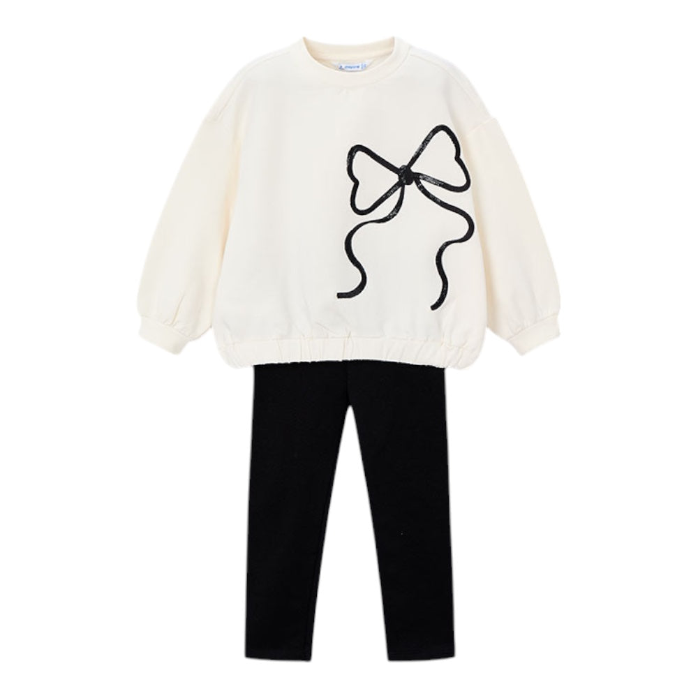 Long sleeved top has an elasticated waistband and is finished with a large appliquéd contrasting bow on the front which is trimmed with sequins.