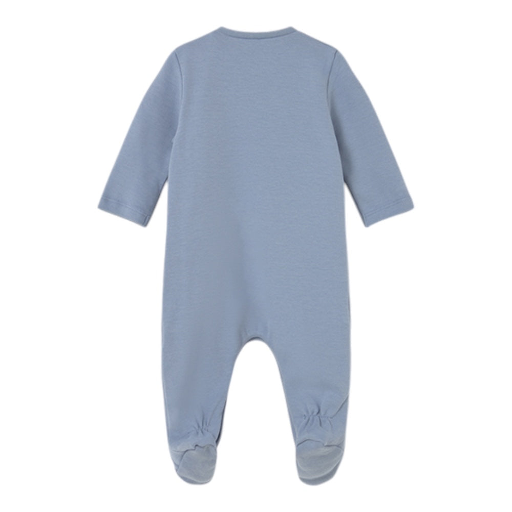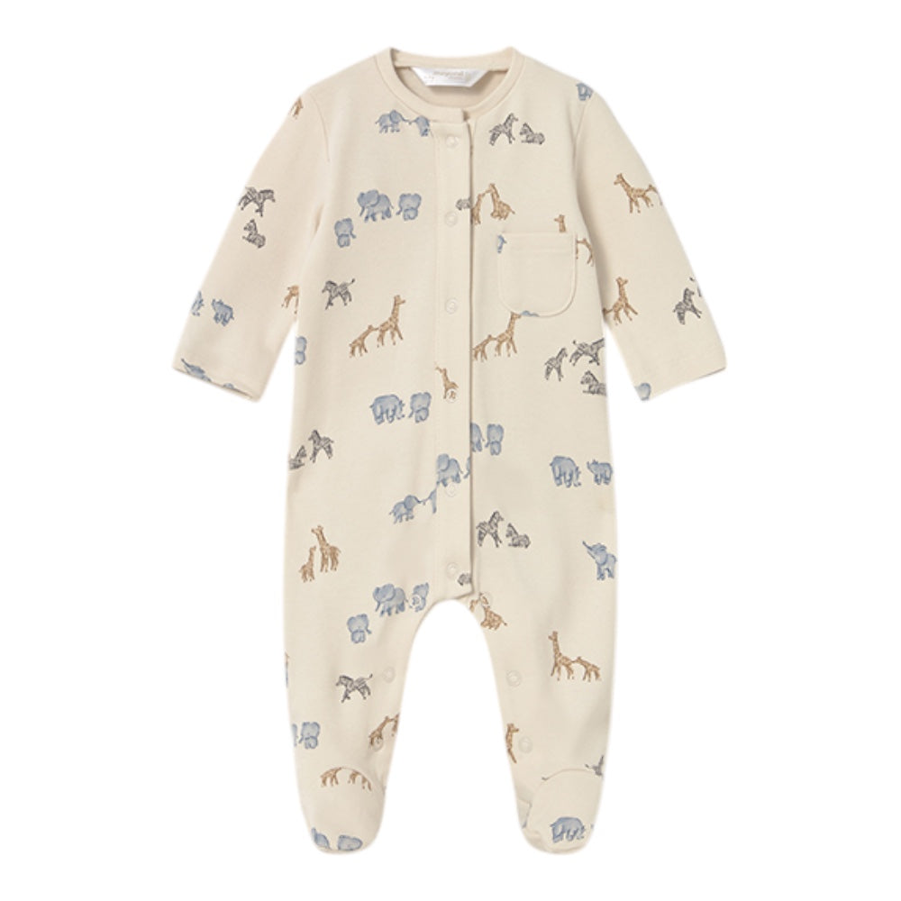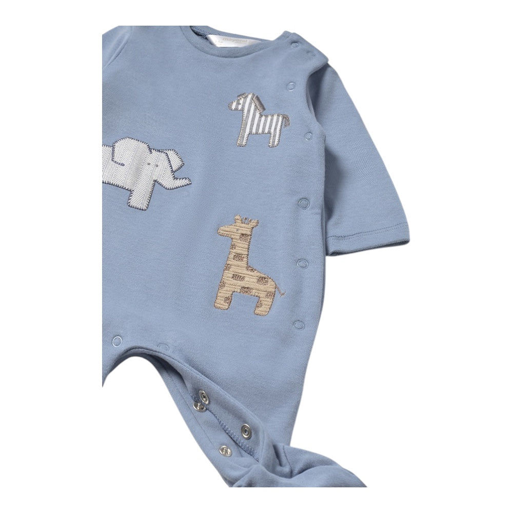 Set of 2 front fastening all in ones - one in all over safari print design, and one in plain blue with appliqued and embroidered safari animals on the front.