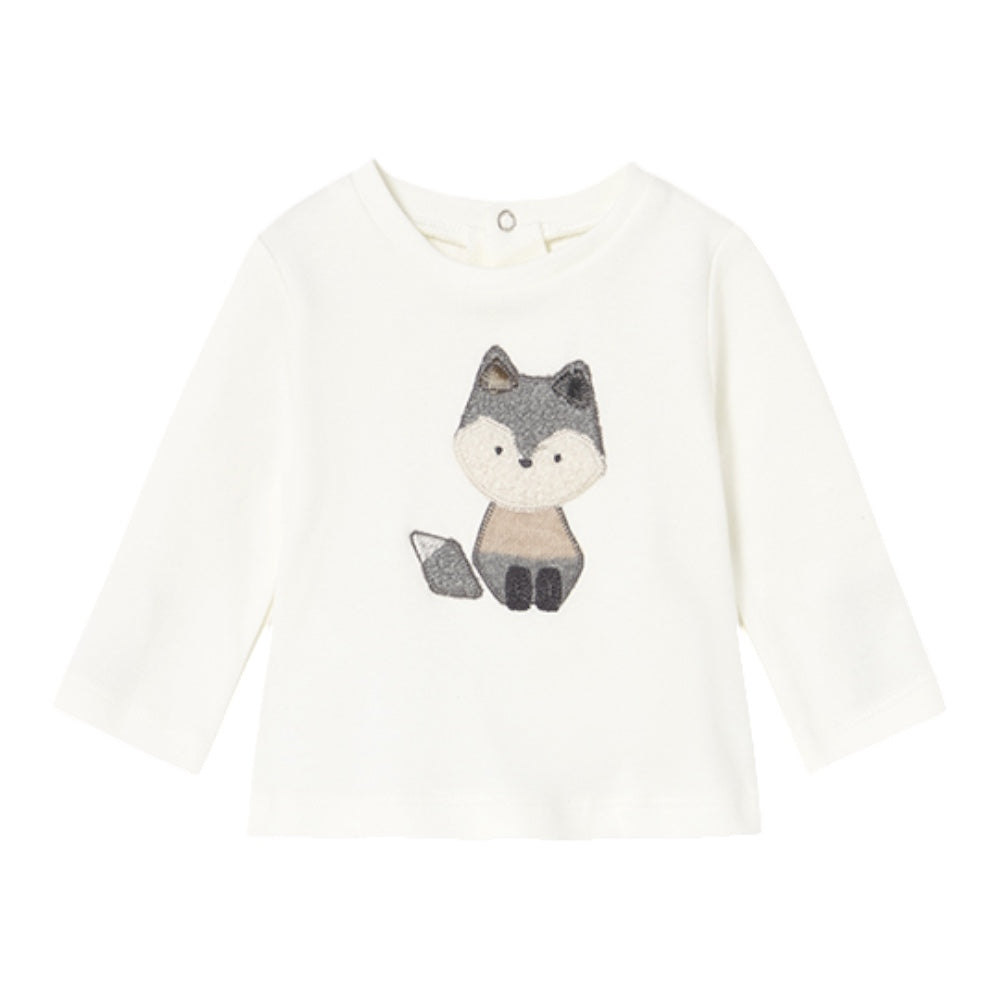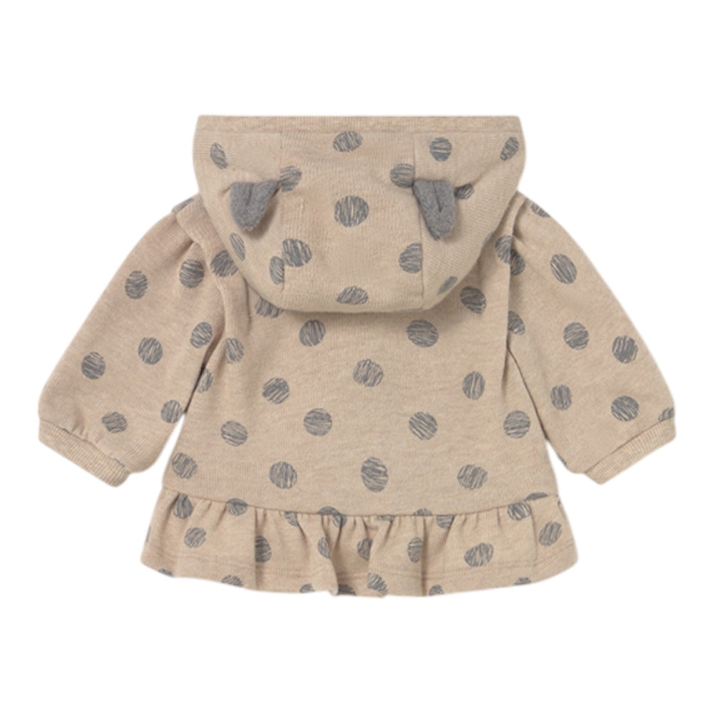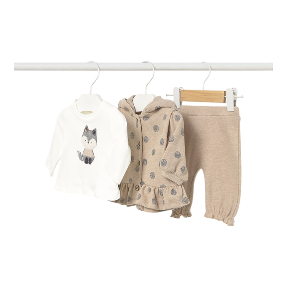 Long sleeved top finished with an appliquéd and embroidered animal design on the front. Matching hooded knitted cardigan with a frilled hemline, button fastening and finished with appliquéd ears on the hood.