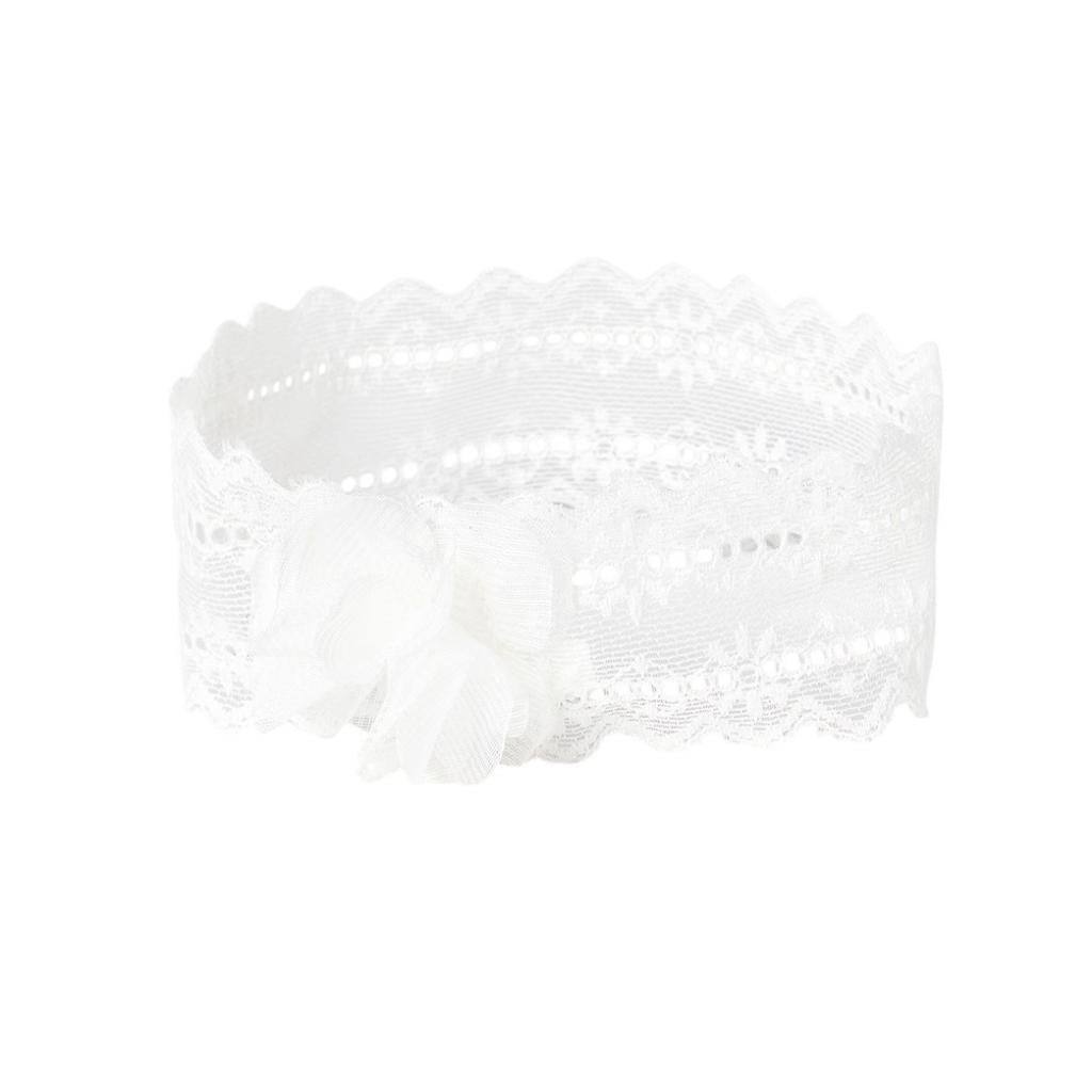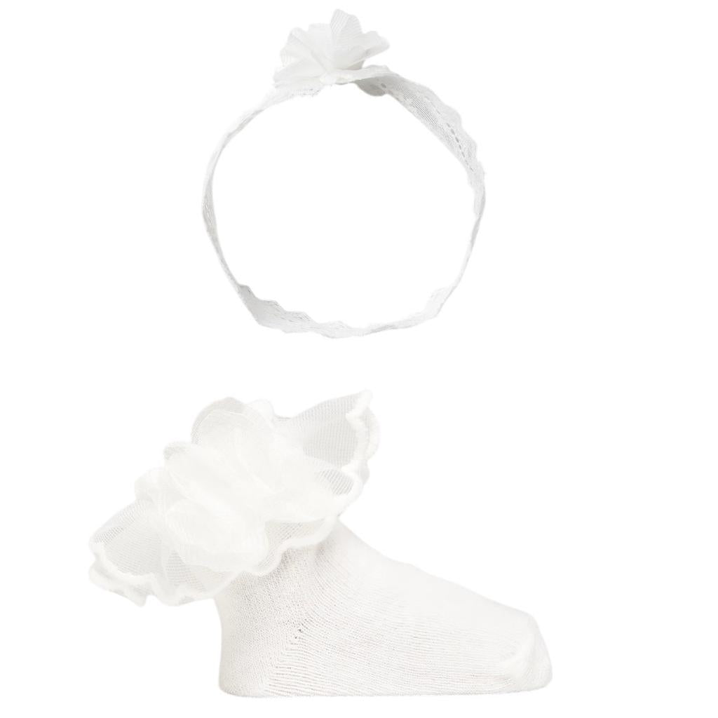 Ankle socks finished with a voile frill and an appliquéd flower, matching stretched lace headband finished with an appliquéd flower.