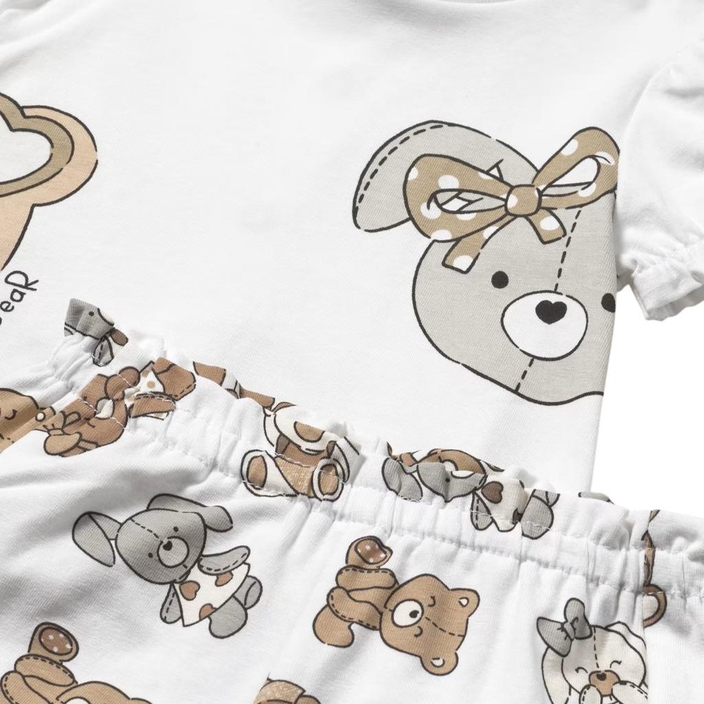 Capped sleeve t shirt with back press stud fastening and a round neckline with a printed bear motif on the front, matching shorts in an all over bear print have a fully elasticated waistband and a frilled hemline.