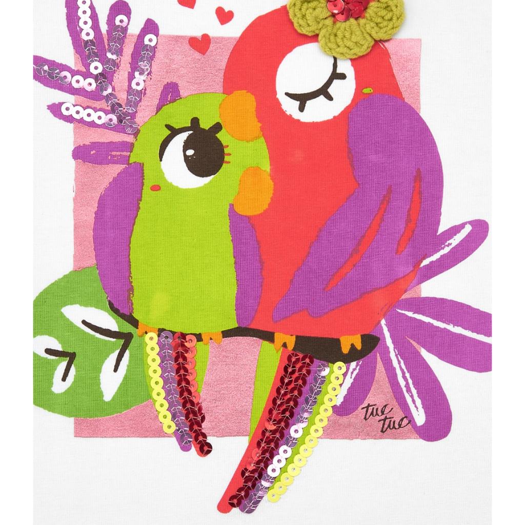 Short sleeved t shirt with a round neckline and a single button fastening at the back. The t shirt has a lovely bright parrot printed design on the front which is finished with sequinned detailing.